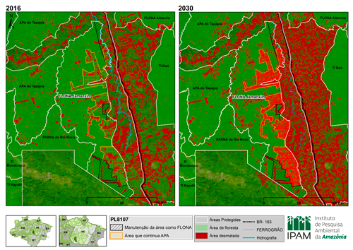 O PL 8107/2017 transforma a área recortada da Flona Jamanxim em APA (área de preservação ambiental), categoria que permite propriedade privada, produção agropecuária e mineração. A Flona ficará com uma área total de 953.613 hectares, perdendo cerca de 25% do seu território, que hoje é de 1,3 milhão de hectares.
