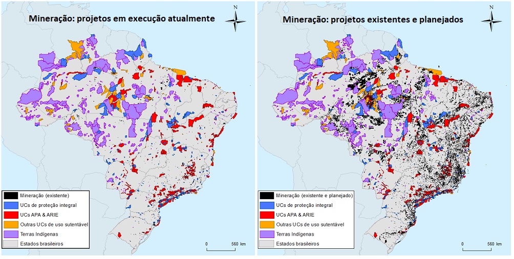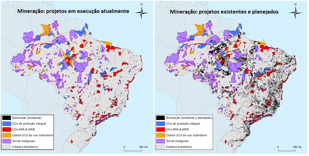 Atualmente, 541 projetos já têm sido planejados em terras indígenas, cujo desenvolvimento significaria a perda imediata de 600.000 hectares. Atualmente, o PL37/2011, que impactaria em 3,7 milhões de hectares com 46 propostas de mineração planejadas para unidades de conservação de uso sustentável, foi retirado de avaliação pelos congressistas. Entretanto, novas alterações com permissões nesse sentido podem voltar à pauta a qualquer momento. A aprovação do PL3682/2012 teria como resultado a perda de 700.000 ha de áreas de proteção integral. No geral, os pesquisadores encontraram 23 áreas protegidas brasileiras que seriam perdidas na totalidade no futuro próximo se estes projetos de lei fossem aprovados e os projetos de mineração já requisitados desenvolvidos.