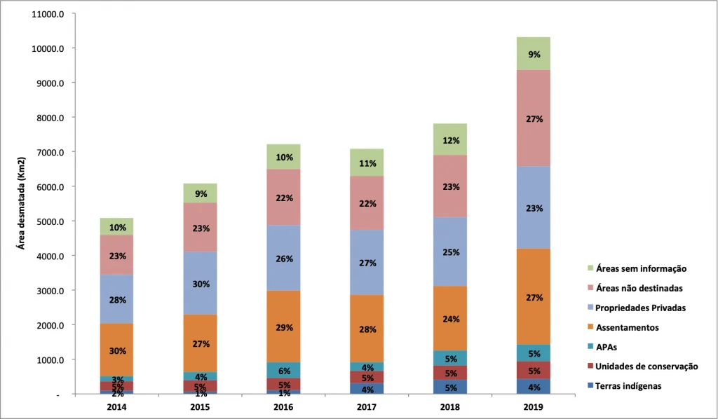 Uma análise realizada pelo IPAM (Instituto de Pesquisa Ambiental da Amazônia) mostrou que 35% do desmatamento ocorrido na Amazônia entre agosto de 2018 e julho de 2019 foi registrado em áreas não-designadas e sem informação.