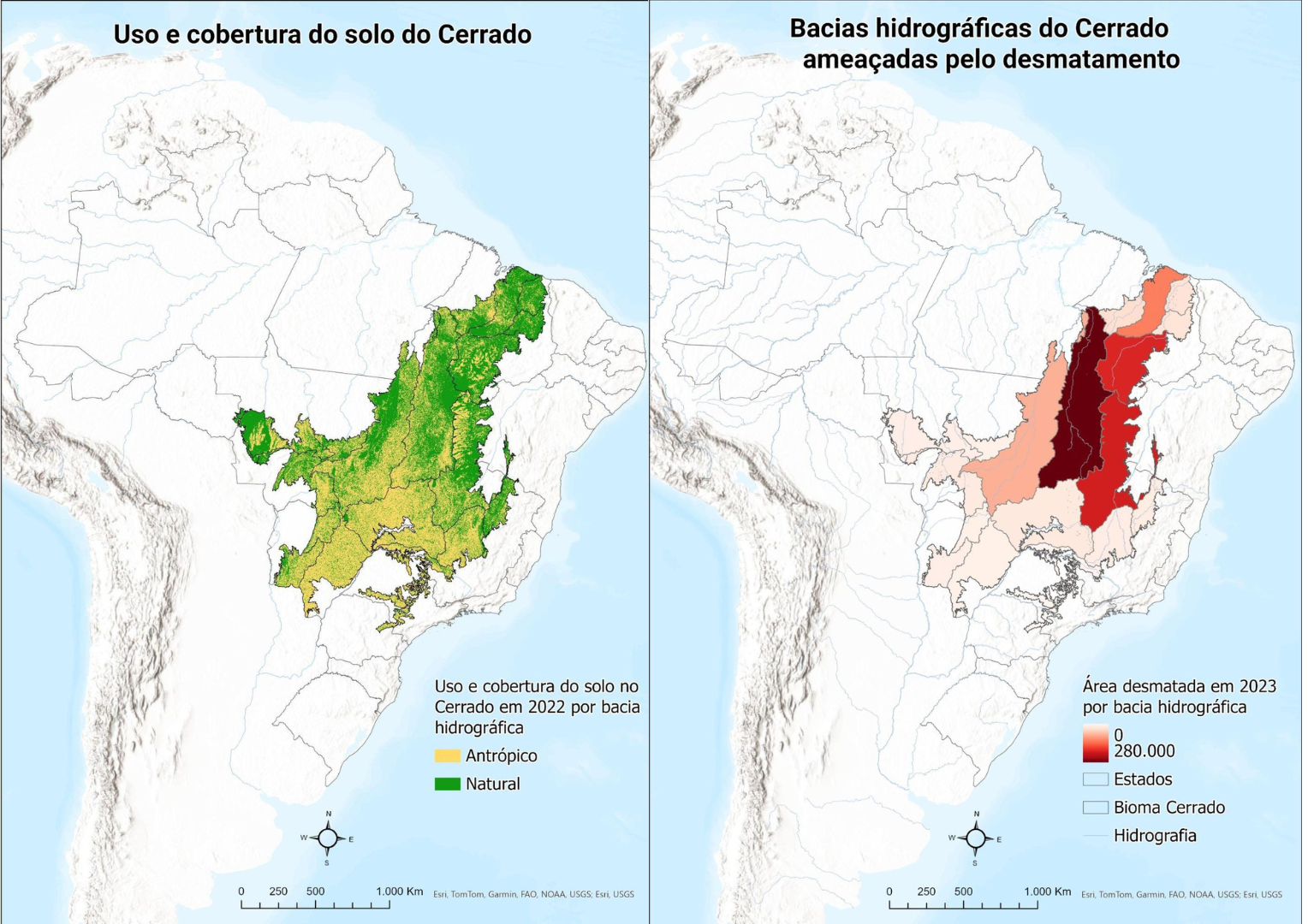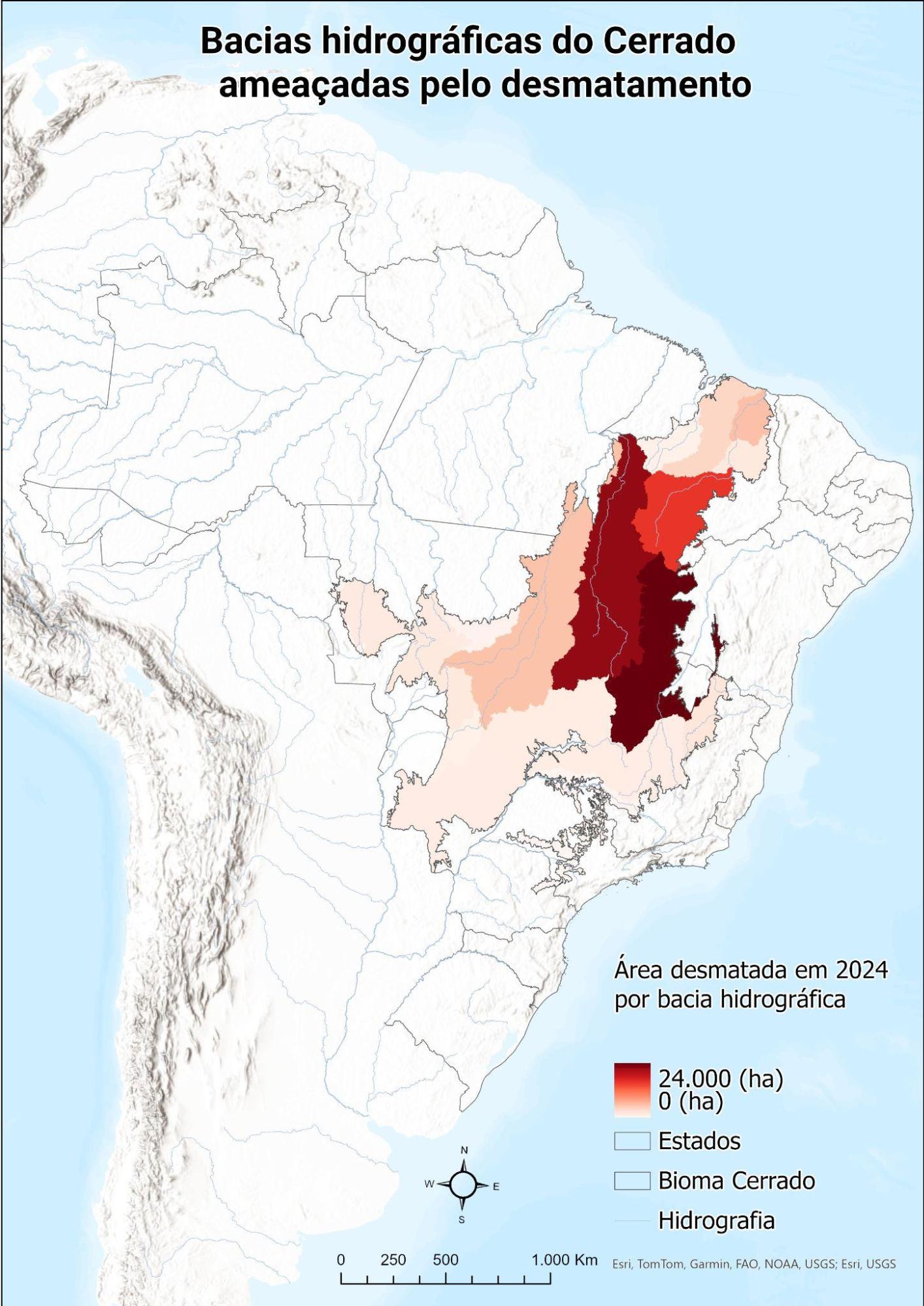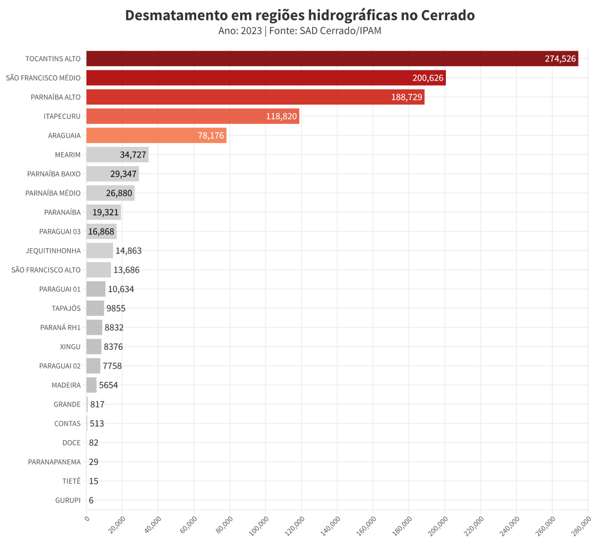 A bacia do Alto Parnaíba teve 189 mil hectares de sua vegetação desmatada – cerca de 13% do desmatamento do bioma em 2023. A bacia abriga as nascentes do Rio Parnaíba, localizado na região central do Matopiba. Essa região é dominada por grandes propriedades, com um crescente uso de água para a irrigação de sua produção. Em 2023, um Parque Nacional foi criado para proteger suas nascentes, mas esse esforço de conservação parece ser ainda insuficiente para a conservação dos recursos hídricos da região.