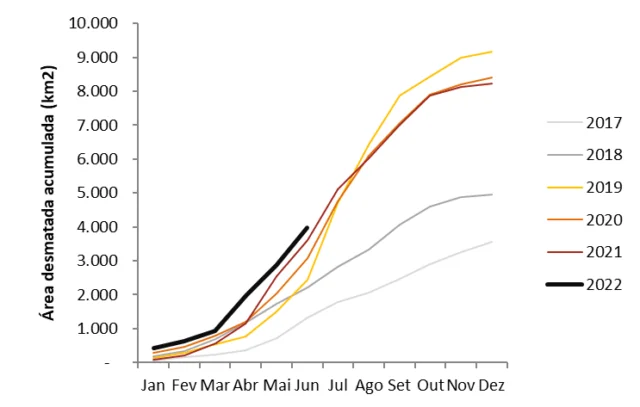 Para o mês de junho, foram 1.120 km² de floresta desmatados, área 5,5% maior que a derrubada em junho de 2021 (1.061 km²) e 7,4% maior que a de junho de 2020 (1.043 km²), o que indica não haver retração no desmatamento no bioma. A diferença é expressiva em relação a junho de 2018: 129% menor que o ocorrido em 2022, com 488 km² desmatados à época. A média de área desmatada nos meses de junho de 2016 a 2018 foi de 683 km² ao ano, enquanto a média desmatada em junho de 2019 a 2022 foi de 1.040 km² ao ano.