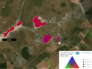 De acordo com dados do MapBiomas, o Cerrado perdeu 970 mil hectares de vegetação típica de áreas úmidas entre 1985 e 2021 – principalmente para pastagem – o equivalente a 12% de todas as áreas úmidas do bioma. Por outro lado, o bioma também viu surgir 780 mil hectares de vegetação secundária de áreas úmidas, aquela que nasce depois da perda da vegetação original. Desse total, 25% cresceram em áreas antes cobertas por superfície d’água – indicando que secaram.