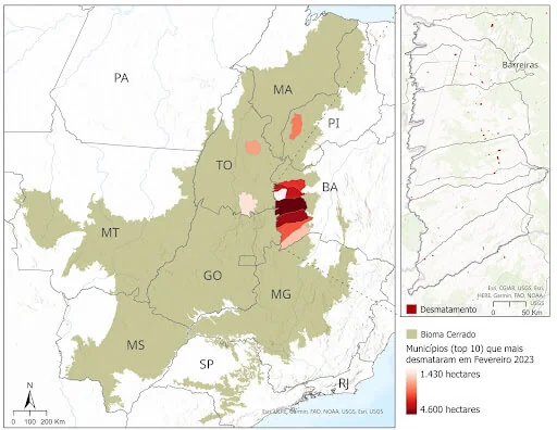 Líderes de desmatamento, os municípios baianos São Desidério, Correntina, Barreiras, Jaborandi e Cocos responderam, juntos, por 16% de todo o Cerrado desmatado no primeiro bimestre de 2023. Esse pico na região também é marcado pelo desmatamento de grandes áreas, a maior parte (87,4%) da área desmatada foram de alertas maiores que 50 ha, e se concentram, principalmente, em propriedades privadas – cerca de 15,6 mil ha ou 98,3%. Já para o bioma, 90,5% da área desmatada em fevereiro ocorreu em áreas privadas. E mais da metade (53,6%) da área desmatada foram de alertas maiores que 50 ha.