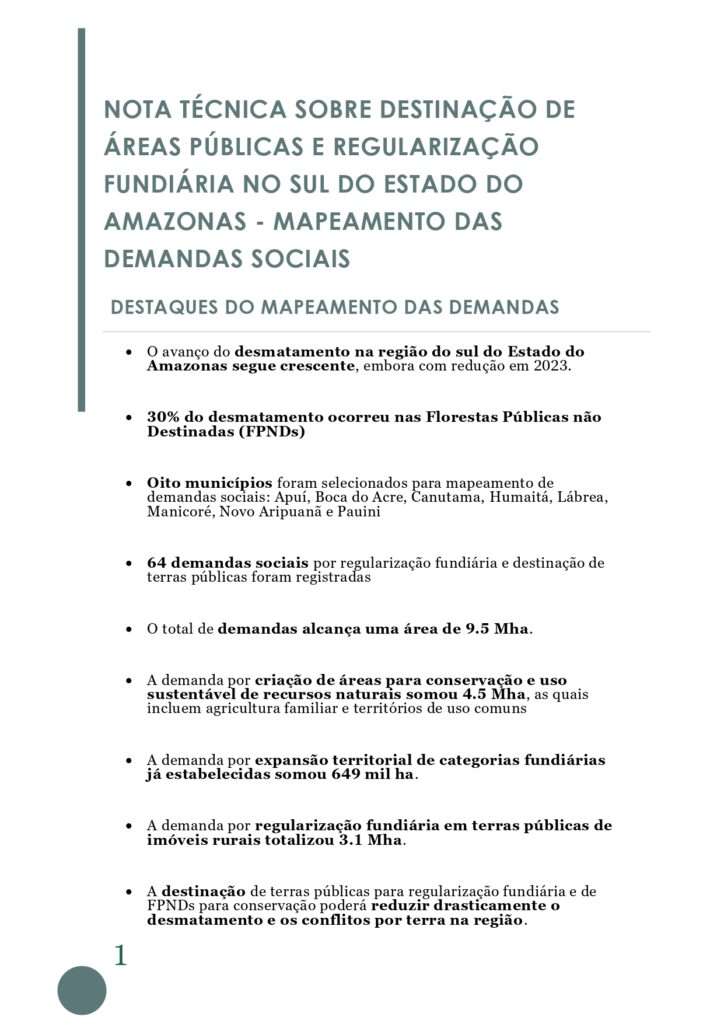 Nota técnica sobre destinação de Áreas Públicas e Regularização Fundiária no sul do estado do Amazonas – mapeamento das demandas sociais