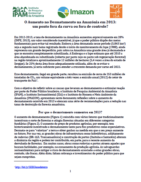 Com o objetivo de refletir sobre as causas que levaram ao desmatamento e estimular reação por parte do Poder Público brasileiro, o documento apresenta dados sobre o aumento do desmatamento ocorrido em 2013 e elencam uma série de recomendações para a redução nas taxas de destruição da floresta amazônica.