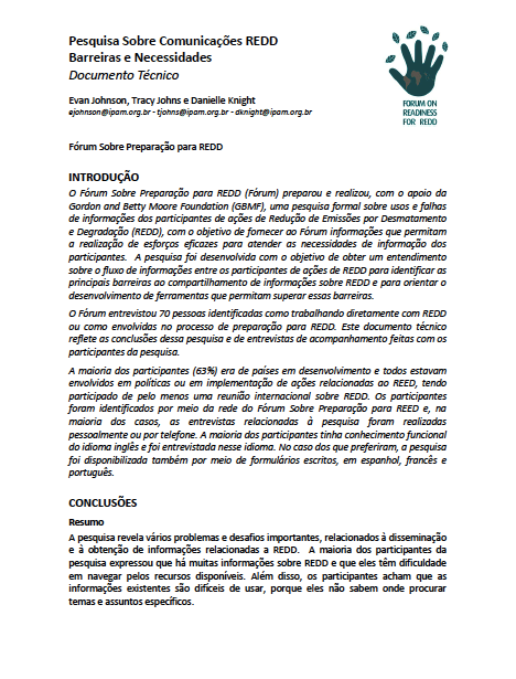 O documento avalia o atual fluxo de informações dentro da comunidade de REDD para entender como ocorre o e quais os principais obstáculos para o intercâmbio de informações de REDD+ e como estes podem ser superados.
