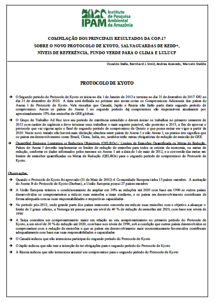 Documento faz uma compilação dos principais resultados da 17ª Conferência das Partes (COP-17) da Convenção-Quadro das Nações Unidas sobre Mudança do Clima, ocorrida entre 09 e 18 de dezembro de 2011, em Durban, África do Sul: o novo Protocolo de Kyoto, Salvaguardas de REDD+, Níveis de Referência, Fundo Verde para o Clima e LULUCF.