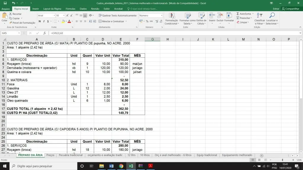 Tabela: Custo de produção de atividade leiteira