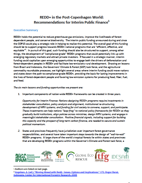 REDD+ in the Post-Copenhagen World: Recommendations for Interim Public Finance
