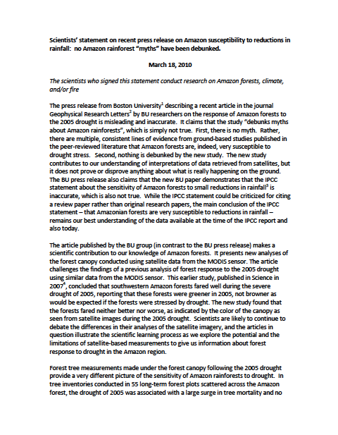 Scientists’ statement on recent press release on Amazon susceptibility to reductions in rainfall: no Amazon rainforest “myths” have been debunked.