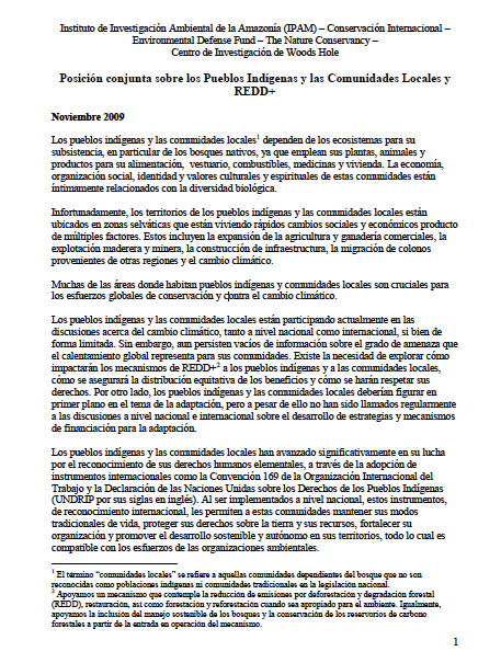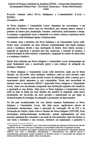El IPAM, junto con las instituciones asociadas: Conservation International, Environmental Defense Fund, Woods Hole Research Center y The Nature Conservancy, ha elaborado cuatro documentos de posición común sobre cuestiones de política en la REDD. Esto es sobre la posición conjunta sobre los Pueblos Indígenas y las Comunidades Locales y REDD+.