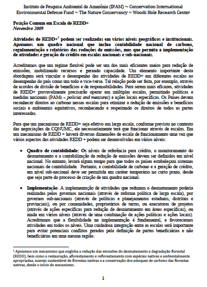 O IPAM, juntamente com suas instituições parceiras: Conservação Internacional, Environmental Defense Fund, Woods Hole Research Center e The Nature Conservancy, produziu quatro documentos de posições comuns sobre aspectos da política de REDD. Este é sobre a Posição Comum em Escala de REDD+.