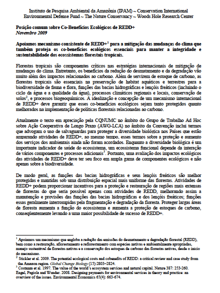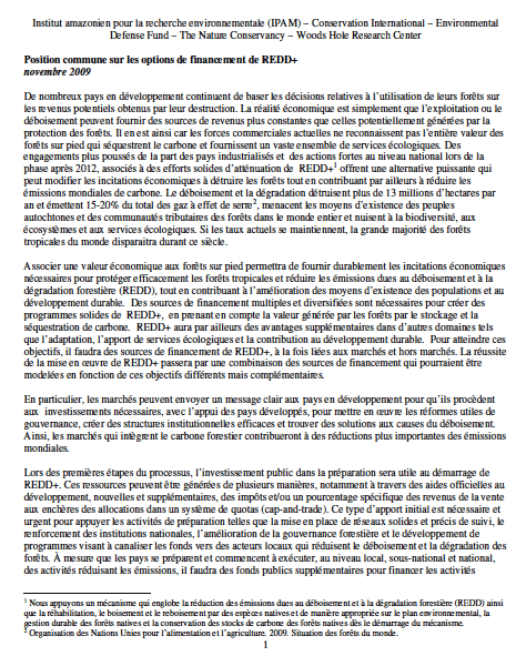 O IPAM, juntamente com suas instituições parceiras: Conservação Internacional, Environmental Defense Fund, Woods Hole Research Center e The Nature Conservancy, produziu quatro documentos de posições comuns sobre aspectos da política de REDD. Este é sobre a Posição Comum sobre as opções de Financiamento de REDD +.