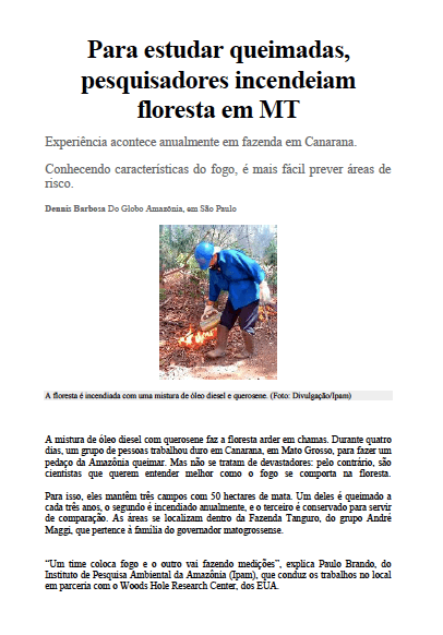 Reportagem do Portal Globo Amazônia aborda o projeto Savanização, do Programa Cenários do IPAM. GLOBO AMAZÔNIA - BARBOSA, DENNIS. Para estudar queimadas, pesquisadores incendeiam floresta em MT. São Paulo. Setembro de 2009.