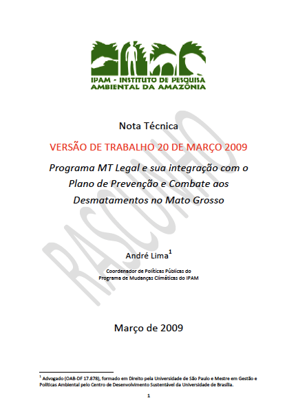 Nota técnica sobre a versão da proposta para regulamentar o programa MT Legal de regularização de imóveis rurais em Mato Grosso. Essa nota técnica apresenta comentários a respeito da proposta de programa com recomendações. LIMA, André. Coordenador de Políticas...