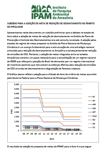 Subsídio preliminar para o debate no Estado do Acre sobre a adoção de metas de redução de desmatamento no âmbito do Plano de Prevenção e Controle dos Desmatamentos ora sob consulta no estado.