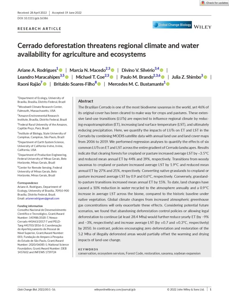 Cerrado deforestation threatens regional climate and water availability for agriculture and ecosystems
