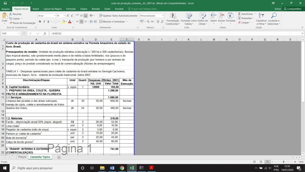 Planilha aberta de custo de produção de castanha-do-brasil em sistema extrativo na floresta Amazônica do estado do Acre O conteúdo faz parte do Módulo Azul, chamado "Análise de Cadeias de Valor", um dos sete temas abordados pelo Programa CapGestão Amazônia.