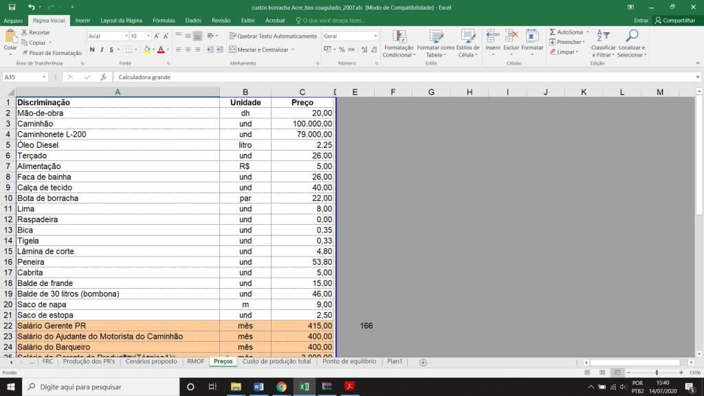 Tabela: Custo de produção da borracha no Acre – látex coagulado