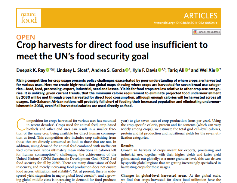 Crop harvests for direct food use insufficient to meet the UN’s food security goal