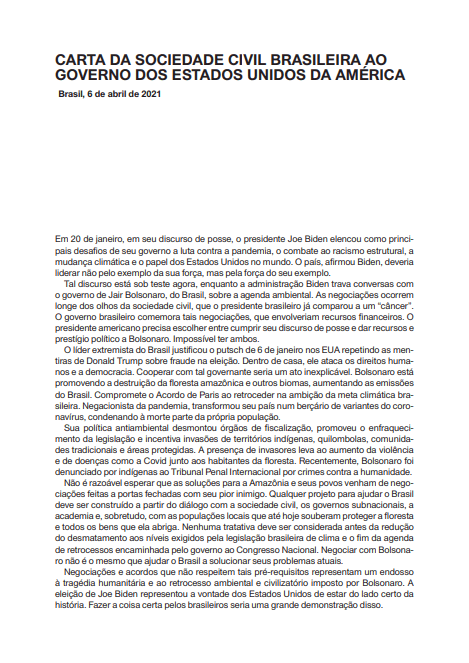 Carta da sociedade civil brasileira ao governo dos Estados Unidos da América
