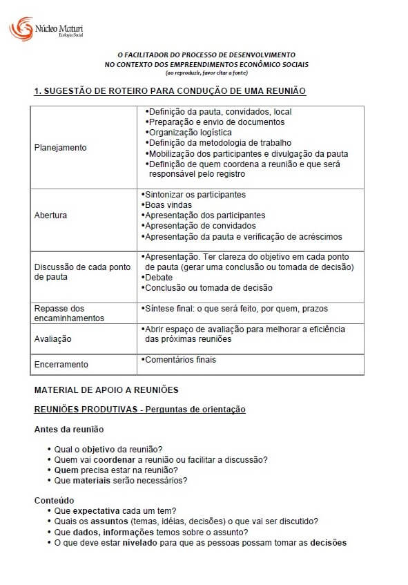 Apostila traz roteiro para a condução de reuniões e também aborda as etapas do processo de tomada de decisão Este material foi elaborado pelo Núcleo Maturi Ecologia Social. Ele faz parte da leitura complementar do Módulo Vermelho, chamado "Facilitação de Processos...