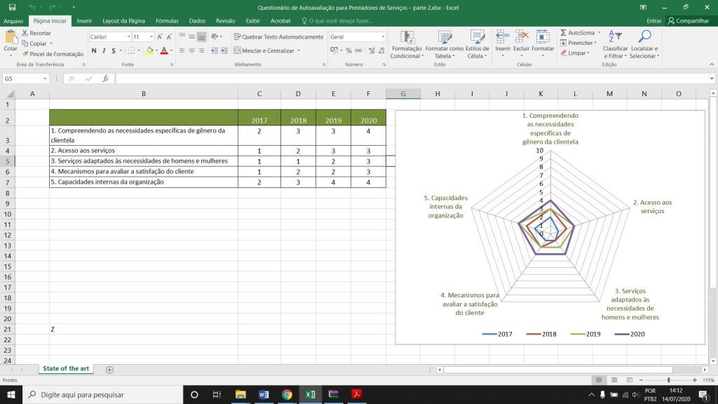Modelo em excel para geração do gráfico de teia/aranha elaborado a partir das respostas da parte 1, que pode ser acessada aqui. Este é um material complementar do Módulo Lilás, chamado "Gênero em Cadeias de Valor", um dos sete temas que compõem o Programa CapGestão...