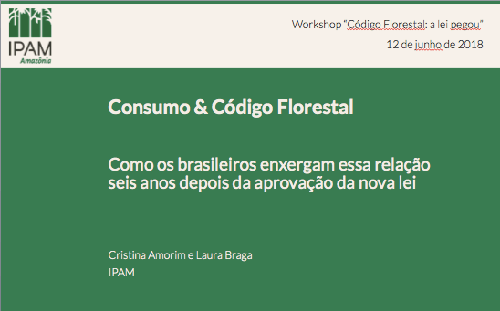 Apresentação de resultados de pesquisa de opinião pública sobre a relação entre consumo, questões ambientais e o Código Florestal, realizada com Ibope e Rede Conhecimento Social, feita em workshop do Observatório do Código Florestal.