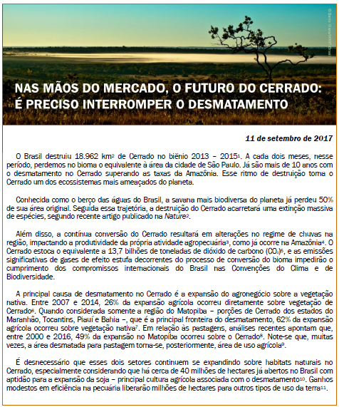 Organizações da sociedade civil pedem uma medida imediata em defesa do Cerrado a ser tomada pelas empresas que compram soja e carne desse bioma, assim como os investidores que atuam nesses setores, no sentido de adotarem políticas e compromissos eficazes para eliminar o desmatamento e desvincular suas cadeias produtivas de áreas naturais recentemente convertidas.