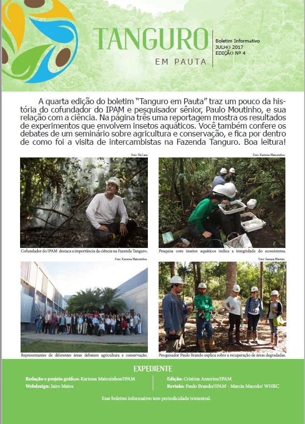 A quarta edição do boletim “Tanguro em Pauta” traz um pouco da his¬tória do cofundador do IPAM e pesquisador sênior, Paulo Moutinho, e sua relação com a ciência. Na página três uma reportagem mostra os resultados de experimentos que envolvem insetos aquáticos. Você também confere os debates de um seminário sobre agricultura e conservação, e fica por dentro de como foi a visita de intercambistas na Fazenda Tanguro.