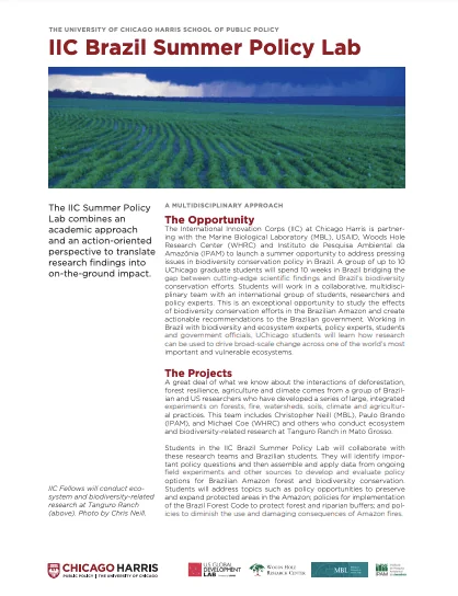 The International Innovation Corps (IIC) at Chicago Harris is partnering with the Marine Biological Laboratory (MBL), USAID, Woods Hole Research Center (WHRC) and Instituto de Pesquisa Ambiental da Amazônia (IPAM) to launch a summer opportunity to address pressing...