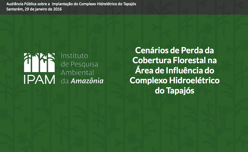 Apresentação feita pela pesquisadora Ane Alencar, do IPAM, em audiência pública realizada em Santarém, (PA) sobre a implantação do complexo. Ela traz um resumo de projeções conduzidas pelo instituto sobre o desmatamento na região com a construção de dez hidrelétricas previstas.