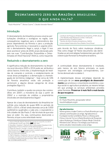 O desmatamento zero na Amazônia brasileira, legal e ilegal, é um movimento inexorável. A Amazônia, o Brasil e o mundo precisam dessa meta atingida. Neste documento, o Instituto de Pesquisa Ambiental da Amazônia (IPAM) defende que o fim do desmatamento amazônico...