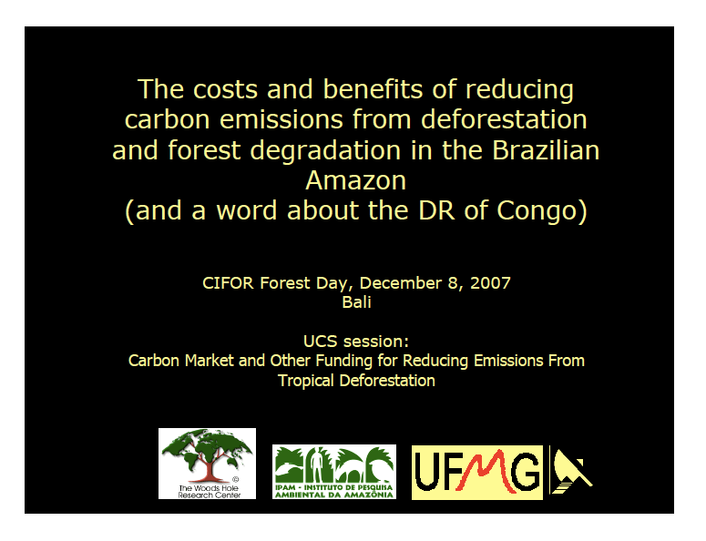 Apresentação, em inglês, sobre custos e benefícios do mecanismo REDD para aplicação na Amazônia brasileira.