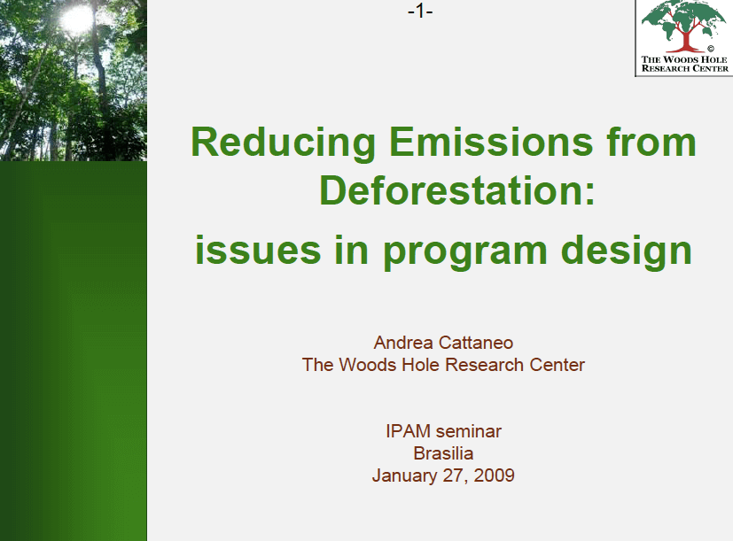 Apresentação com algumas questões sobre a política de design do mecanismo REDD, feita em seminário no IPAM. O documento está em inglês. THE WOODS HOLE RESEARCH CENTER - CATANEO, ANDREA. Reducing Emissions from Deforestation: issues in program design. Brasília/DF....