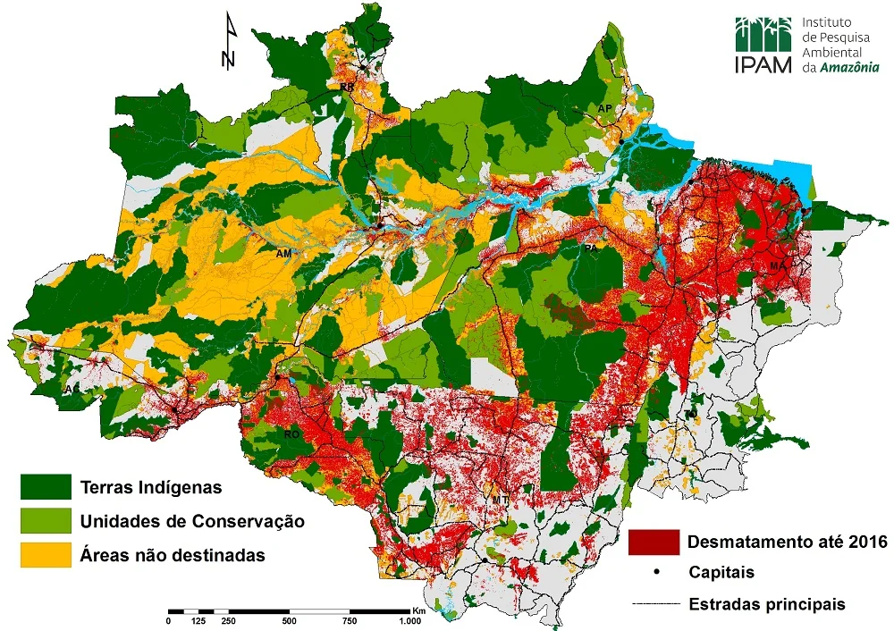 O mapa abaixo mostra que o desmatamento no interior das TIs não chega a 2%, enquanto nas áreas adjacentes a estas este percentual é maior que 30%.