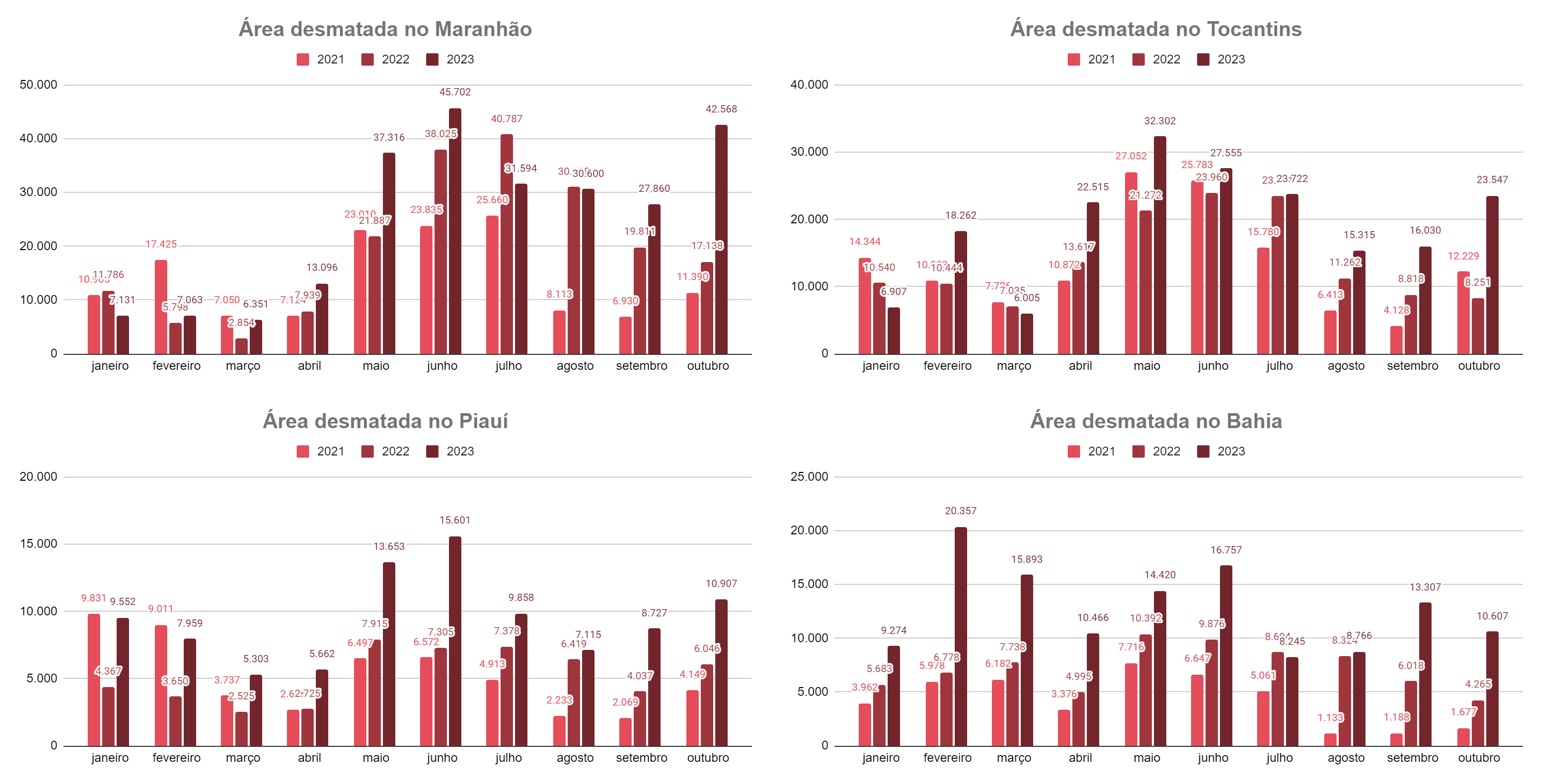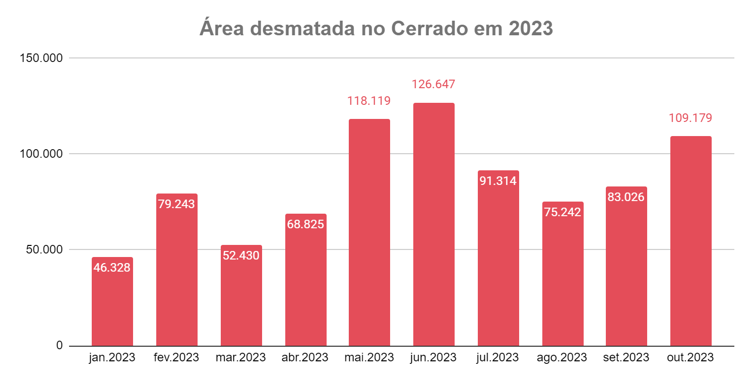 No Maranhão, foram desmatados 42,5 mil hectares de vegetação nativa, um aumento de 148% em relação a outubro do ano passado. No Tocantins, o segundo estado que mais desmatou em outubro de 2023, o aumento foi de 185%, chegando a 23,5 mil hectares. O Cerrado baiano, por sua vez, perdeu 10,6 mil hectares em outubro, 148% a mais do que em 2022. O Piauí registrou 10,9 mil hectares desmatados, aumentando 80% do seu desmatamento em relação ao mesmo período do ano passado.