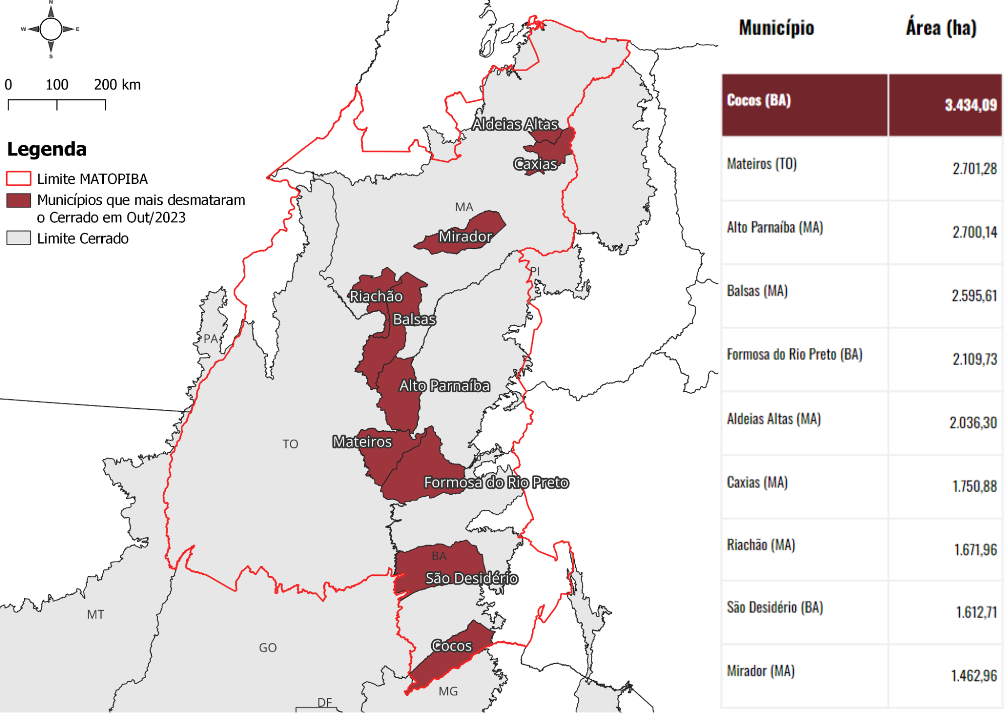 O aumento das taxas em outubro foi novamente liderado por estados do Matopiba – fronteira agrícola composta por partes dos estados do Maranhão, Tocantins, Piauí e Bahia – e intensificado pela forte seca que atinge o bioma. Pesquisadoras do IPAM (Instituto de Pesquisa Ambiental da Amazônia) apontam que a tendência de diminuição na abertura de novas áreas, esperada para o mês de outubro, pode ter sido revertida por conta da falta das chuvas.