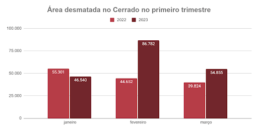 O tamanho das áreas de Cerrado desmatadas também aumentou. Segundo levantamento do SAD, entre janeiro e março de 2023, alertas de desmatamento com mais de 50 hectares corresponderam a 51,3% de todo o desmatamento registrado. Em 2022, áreas desse tamanho representavam menos de 30% de todos os alertas de desmatamento registrados para o bioma.