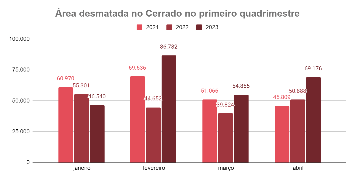 Dados de abril confirmam a tendência de aumento registrada no início de 2023. Os primeiros quatro meses do ano totalizaram cerca de 257,3 mil hectares desmatados, mais que o dobro da área da cidade do Rio de Janeiro. Números representam um aumento de quase 35% em relação ao registrado nos primeiros quatro meses do ano passado. Os estados da Bahia, Tocantins, Maranhão e Piauí responderam por volta de 69% do desmatamento do Cerrado nesse período, com cerca de 177,8 mil hectares derrubados.