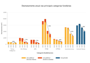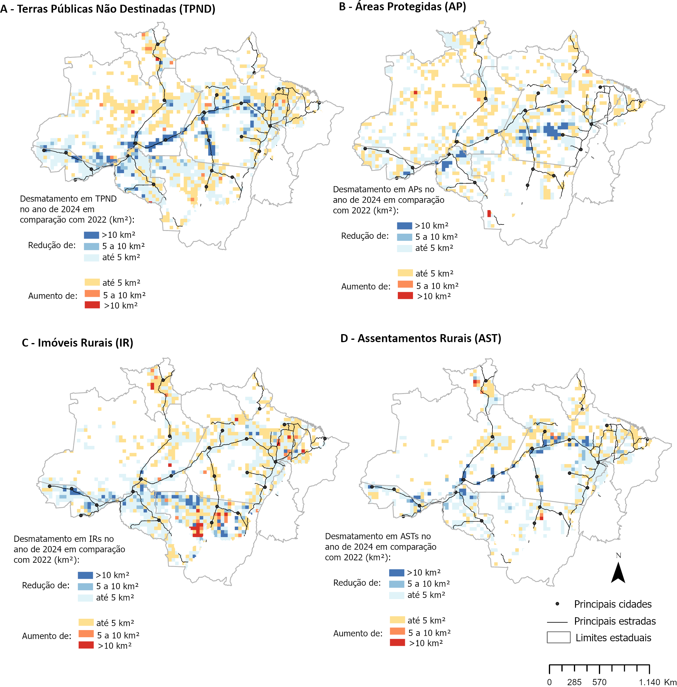 As FPND (Florestas Públicas Não Destinadas) tiveram uma queda de desmatamento de 60% (2,4 mil km²) em 2024, em comparação a 2022, foi a maior redução de área absoluta desmatada entre as categorias fundiárias.