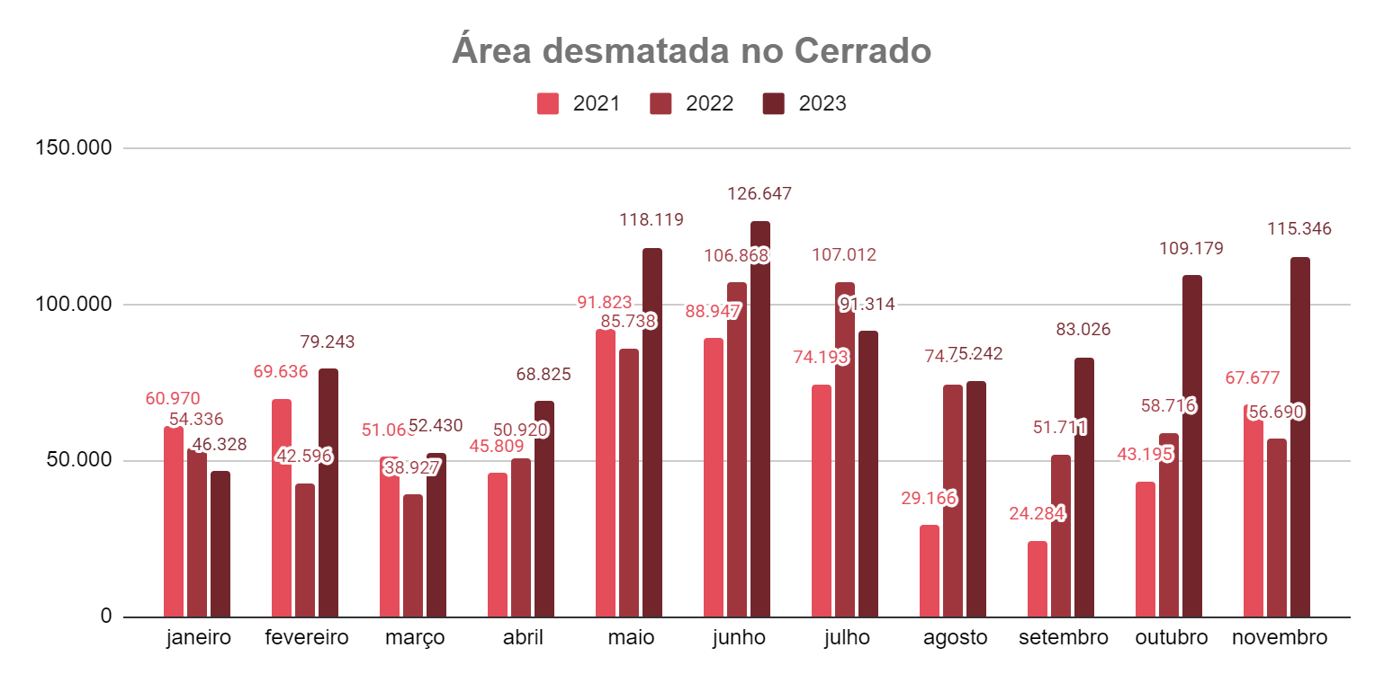 No cerrado baiano, o aumento nesse mês de novembro chegou a 671%, passando de 2,4 mil hectares desmatados em novembro de 2022 para 18,9 mil hectares em 2023. Já no Piauí, onde foram desmatados 18,1 mil hectares, o aumento foi de 259%. No Maranhão, estado que liderou o desmatamento em novembro, o crescimento foi de 131% e 32,7 mil hectares desmatados, enquanto o Tocantins aumentou seu desmatamento em 74%, chegando a 22,8 mil hectares perdidos.