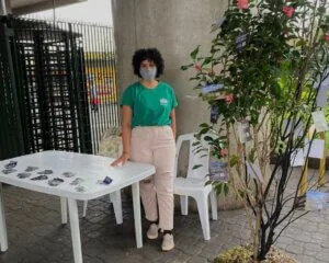 Ana Carolina Morais, jornalista no IPAM, no primeiro dia da iniciativa na estação de metrô do Capão Redondo. Foto: Olivia Zerbini/IPAM