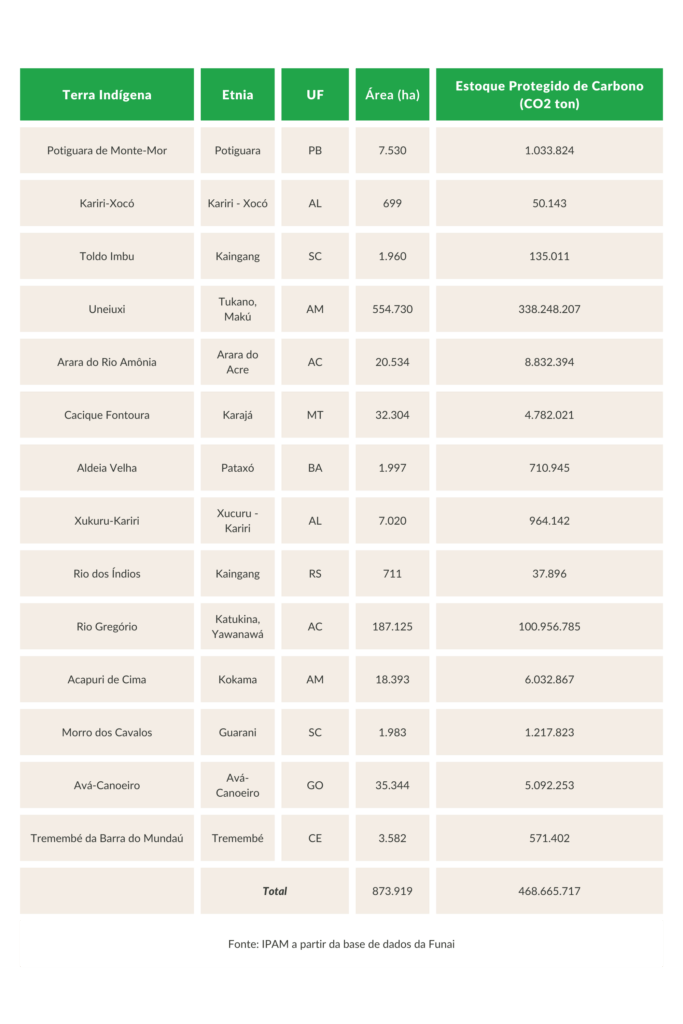 A homologação de 14 terras indígenas anunciada pela ministra dos Povos Indígenas Sonia Guajajara, se concretizada, será, também, um passo no combate à emergência climática global, na avaliação do IPAM (Instituto de Pesquisa Ambiental da Amazônia). Os pesquisadores calculam que a medida deverá proteger um estoque de 468 milhões de toneladas de carbono, expresso em CO2, equivalente a mais de quatro anos de emissões brasileiras por processos industriais, ou a 20% de todas as emissões anuais do país.