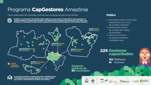 O CapGestores, por sua vez, com enfoque nas compras públicas da agricultura familiar, entre junho e agosto de 2019, qualificou 215 servidores e servidoras das administrações públicas municipal, estadual e federal do Acre, Amazonas, Amapá e Pará.