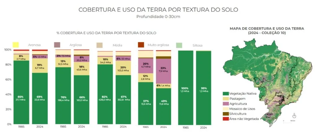 Historicamente solos muito argilosos são os mais utilizados para a agricultura e ocuparam 33% dessa textura em 2024. É a única classe textural de solo onde a agricultura supera a pastagem. Isso é reflexo das condições físicas favoráveis do solo argiloso para o desenvolvimento de raízes, maior capacidade de armazenamento de nutrientes e maior estabilidade estrutural, reduzindo a erosão e favorecendo o manejo.