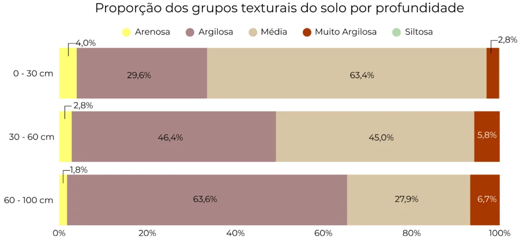 Os resultados mostram que mais da metade do Brasil (63,4%) possui textura média na camada superficial (0–30 cm). Solos argilosos aparecem em segundo lugar (29,6%), enquanto as texturas arenosa, siltosa e muito argilosa somam apenas 7% do território nacional. A distribuição das texturas varia entre os biomas: na Mata Atlântica, 52% dos solos superficiais são muito argilosos, uma proporção bem diferente de biomas como Caatinga, Cerrado e Pampa, onde predomina a textura média. Já entre 60 e 100 cm de profundidade, o país torna-se majoritariamente argiloso (63,6%).