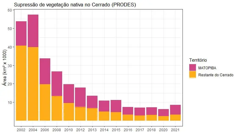 O Matopiba – que compreende os Estados da Bahia, do Maranhão, do Piauí e de Tocantins – bateu recorde de concentração do desmatamento no Cerrado. Do total de vegetação suprimida no bioma entre agosto de 2020 e julho de 2021, 61,3% (5227,32 km²) esteve concentrado na região. Trata-se de um registro histórico para a série Prodes (2002–2021), superando o ano de 2017, quando a região foi responsável por 61,1% da derrubada no Cerrado.
