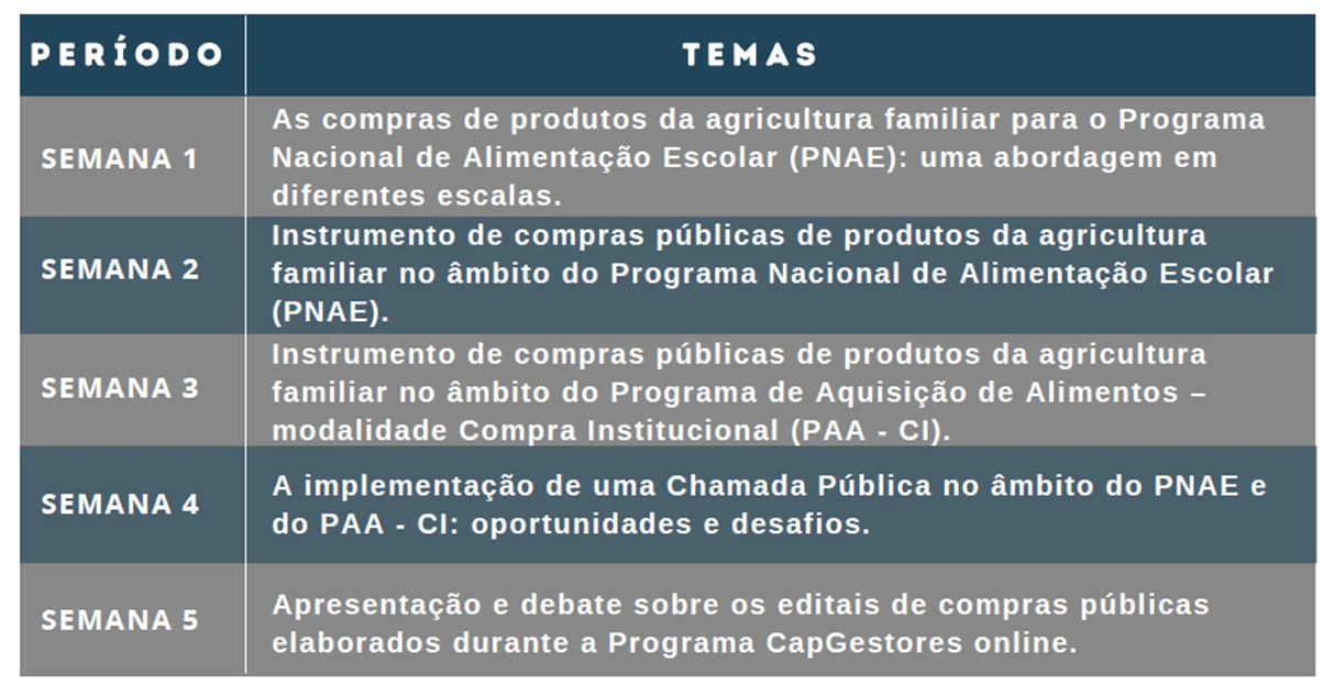 O Programa CapGestão – que tem carga horária de 240 horas – foi realizado ao longo de um ano, entre julho de 2020 e junho de 2021, envolvendo 14 municípios do Pará, no âmbito do projeto “Fortalecimento de capacidades locais para a gestão de empreendimentos e ampliação da comercialização de produtos da agricultura familiar”, com o apoio do Instituto Humanize. Já o Programa CapGestores, com carga horária menor, de 40 horas, foi realizado entre maio e junho de 2021.