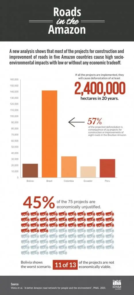 Roads are key vectors of deforestation in the Amazon. They pass through regions that were previously difficult to access and allow people to stop easily, unlike waterways and railways. The impact on the forest is estimated to be 20 kilometers to each side. Since the study does not take opening secondary and tertiary roads off of the new highways into account, the affected area of deforestation tends to be even larger.
